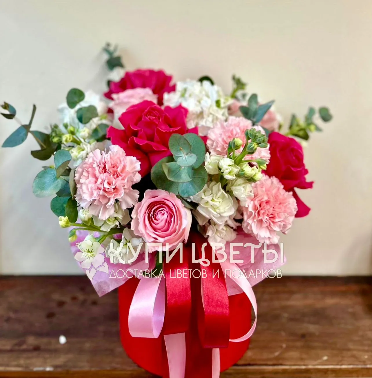 Французкая роза, роза, гвоздика, эвкалипт, шляпная коробка, лента