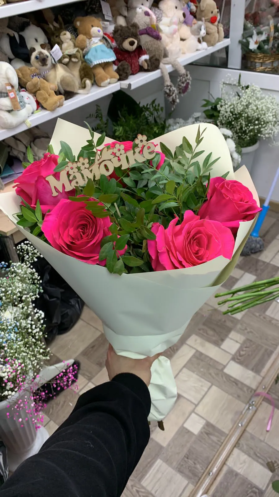 • Средний - роза - 9 шт., зелень, топпер, упаковка, лента