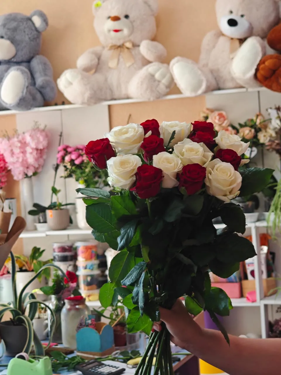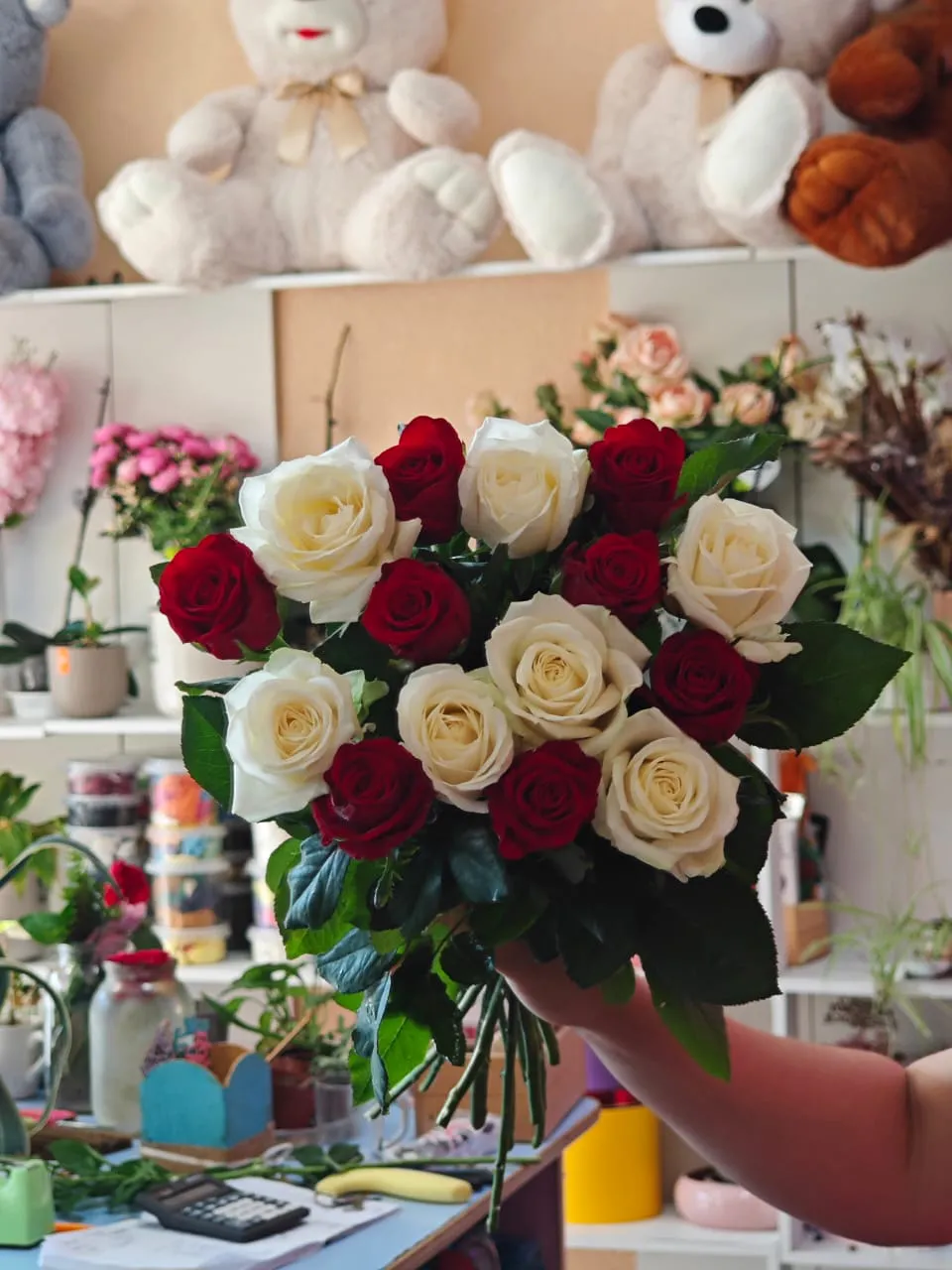 Классическое  сочетание красных и белых роз под ленту выглядит очень ярко, стильно и привлекательно. Такое сочетание цветов всегда в моде.  Если вы не можете выразить чувства словами, в этом вам всегда помогут цветы.