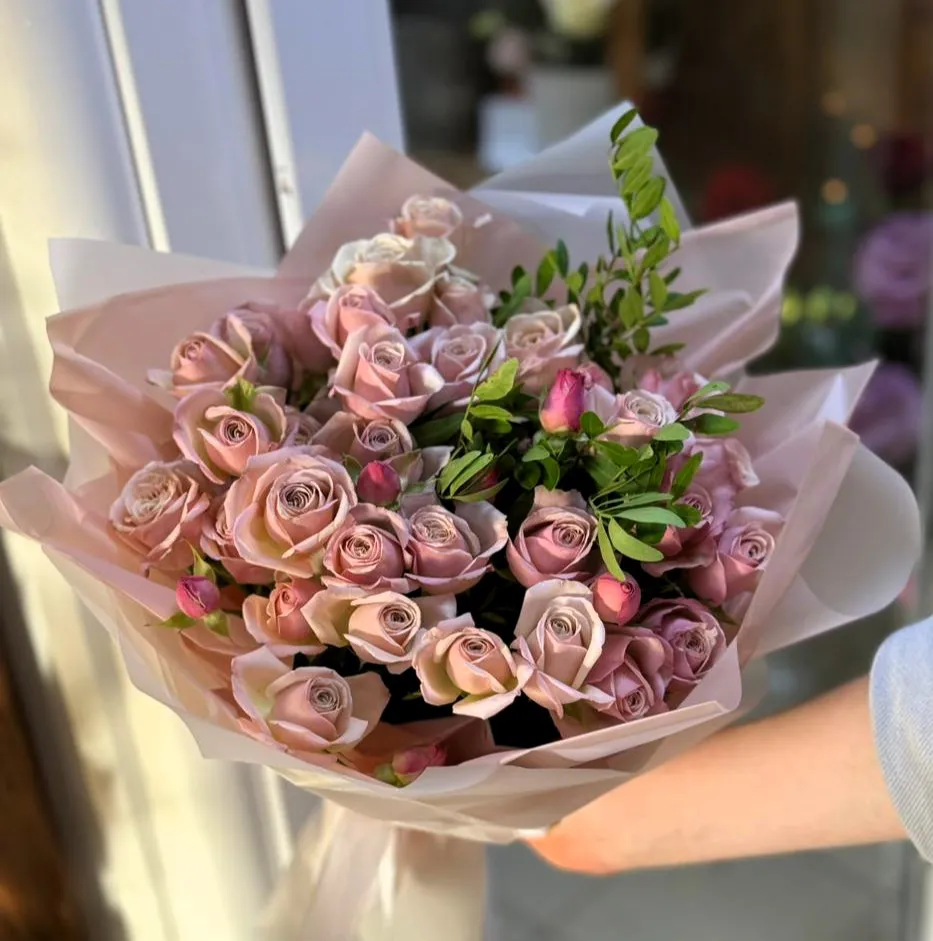 Букет из розовых кустовых роз — это настоящий символ нежности и утонченности. Каждая роза в этом букете словно искусно создана природой: ее многослойные лепестки излучают мягкий блеск, а их оттенок варьируется от светлого пастельно-розового до насыщенно-ягодного. Такие розы обладают выразительной форме и изящным ароматом, который наполняет пространство тонкими нотами весенней свежести.