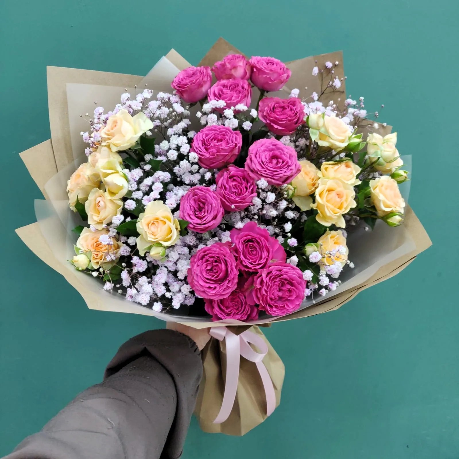 Пышные кустовые розы  с их множеством бутонов и нежная гипсофила создают волшебный дуэт, наполненный легкостью и свежестью. Этот букет станет ярким акцентом в любом интерьере и подарит незабываемые эмоции