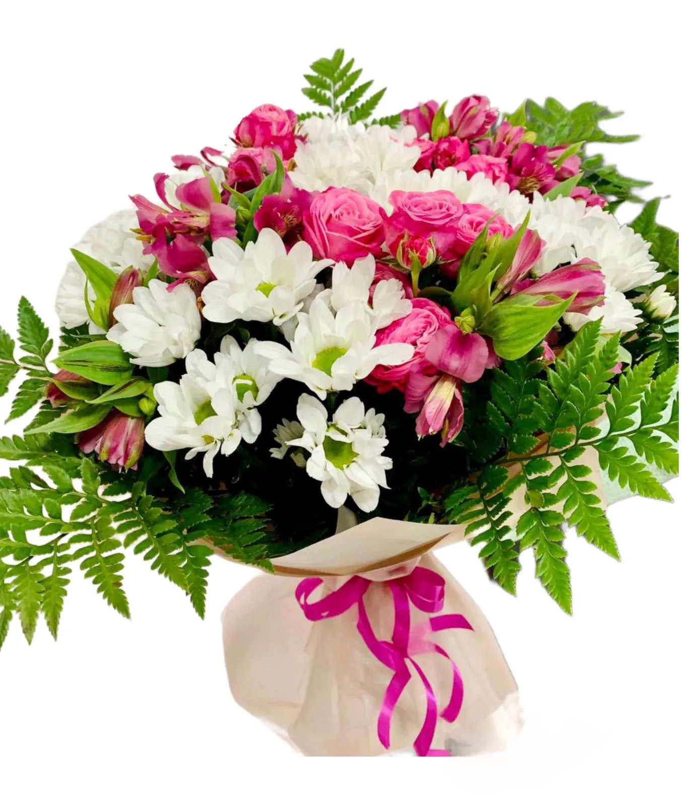 • Средний - кустовая роза - 5 шт., альстромерия - 4 шт., хризантема - 2 шт., зелень, упаковка, лента