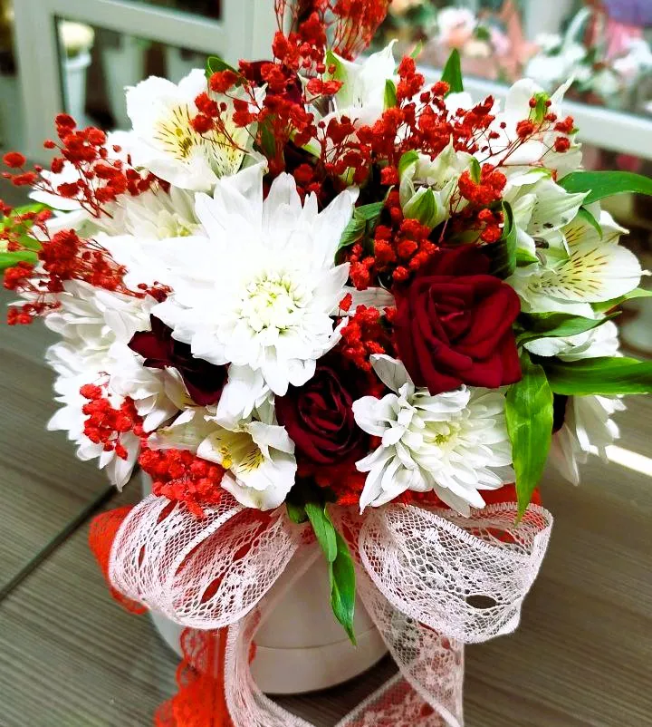 Шляпная коробка с розами и хризантемами в ярких тонах — это идеальный выбор для тех, кто хочет подчеркнуть свою индивидуальность и выразить яркие эмоции. Такие букеты не только радуют глаз, но и создают атмосферу праздника и уюта.