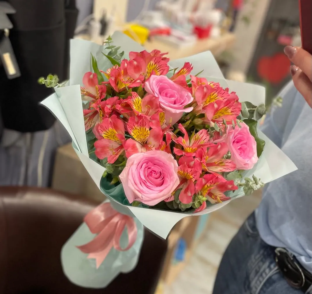 Альстромерия, роза, упаковка, лента