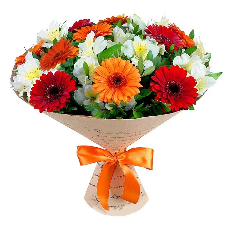 • Средний (гербера - 9 шт., альстромерия - 6 шт., зелень, упаковка, лента)