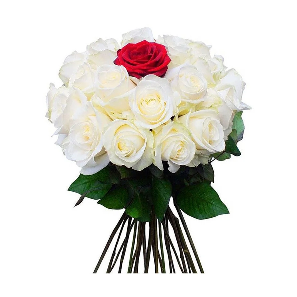 Оригинальный букет с одной красной розой в середине  белых роз. Выглядит  невероятно стильно и воздушно. Однозначно понравится и вызовет самые яркие эмоции.