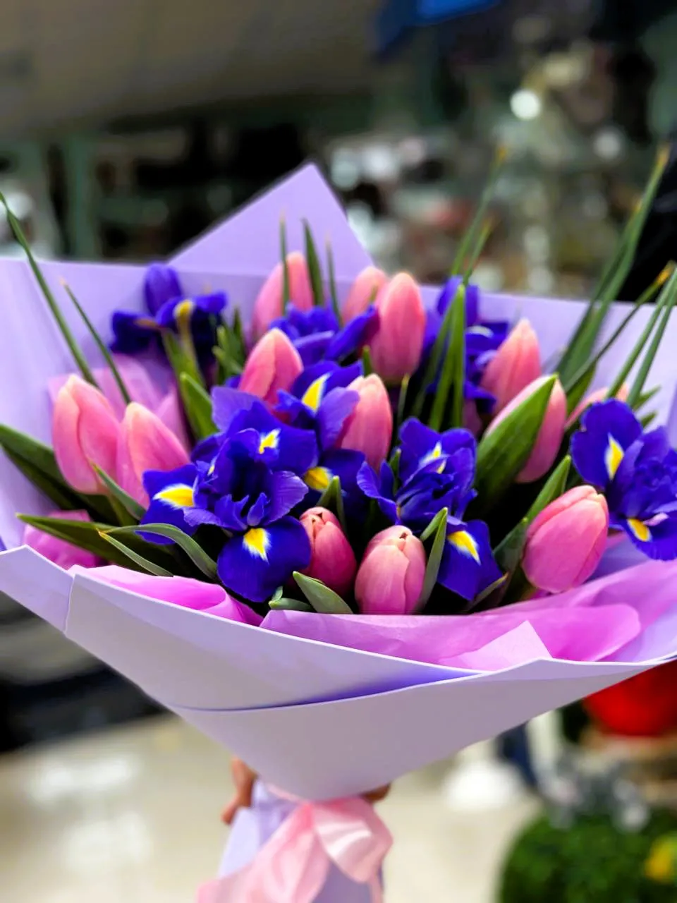 Букет из розовых тюльпанов и ирисов — это настоящая симфония весенней красоты и нежности