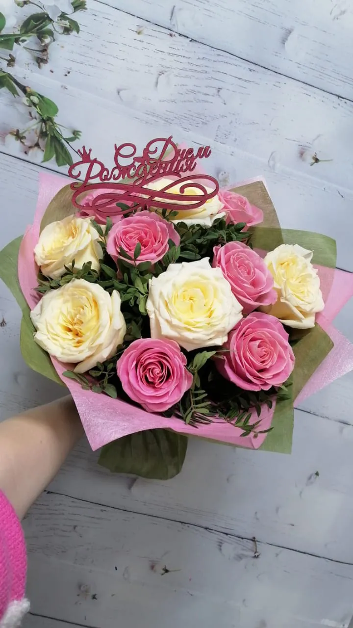 • Средний - роза - 9 шт., зелень, топпер, упаковка, лента