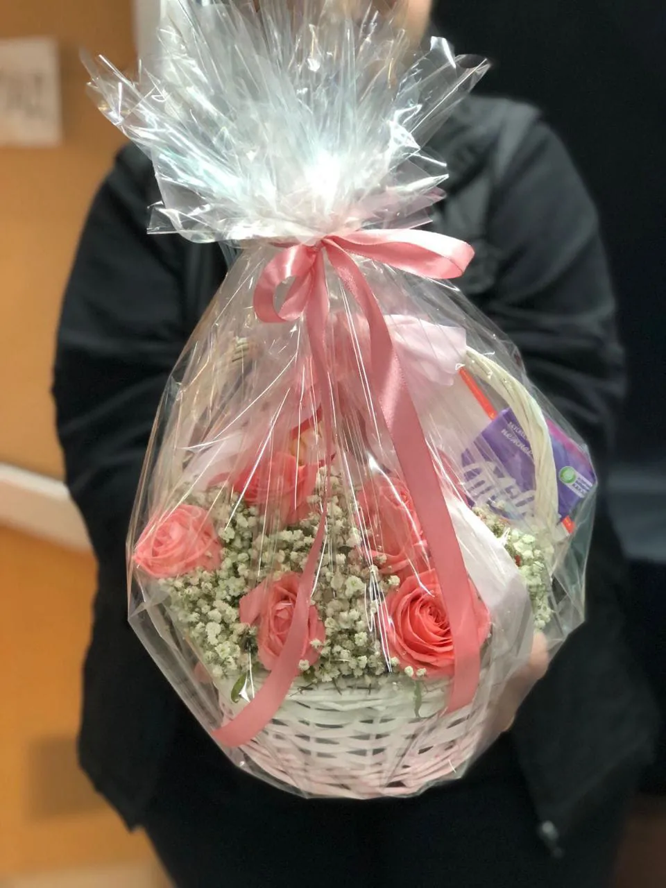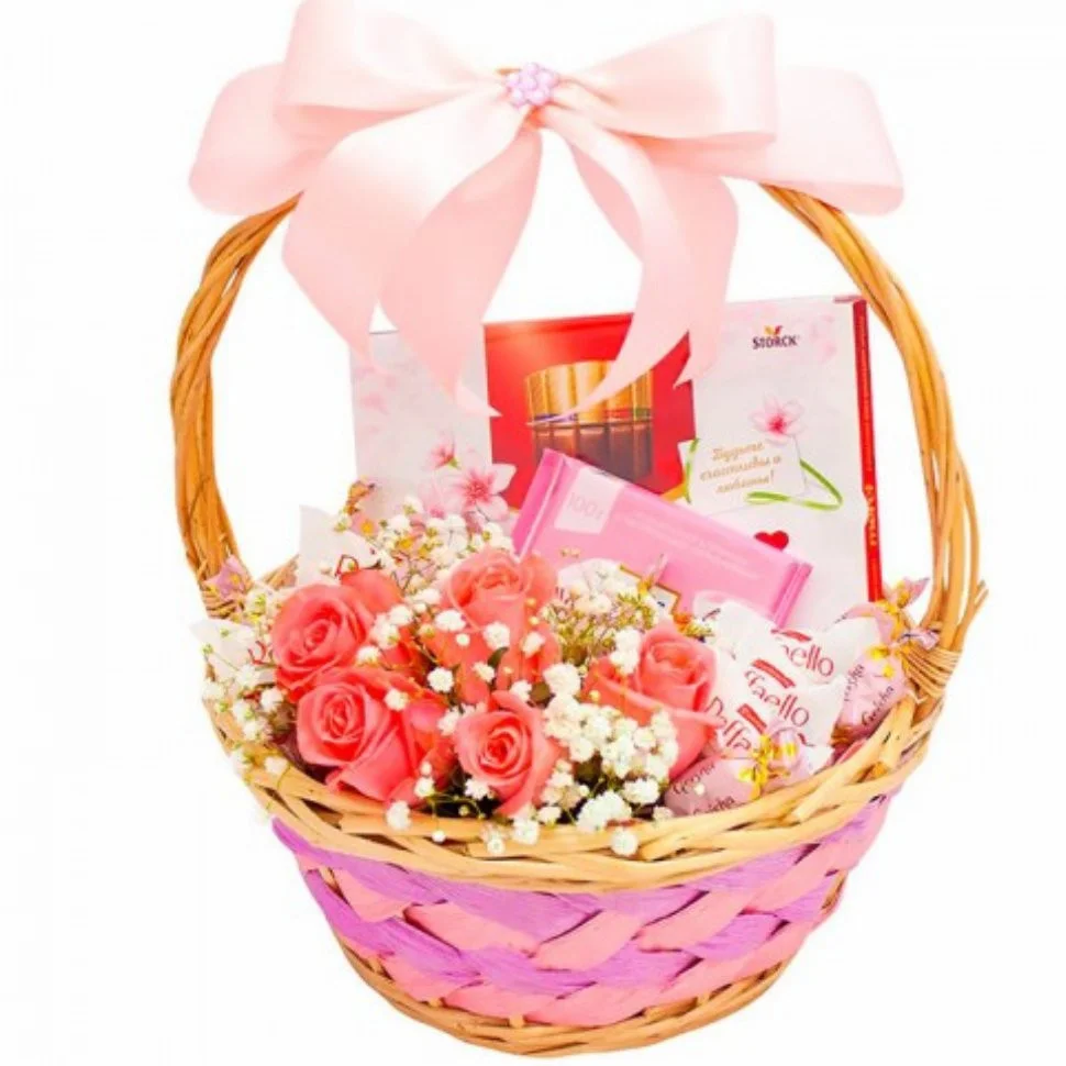роза - 5 шт., гипсофила - 2 шт., коробка конфет Merci - 1 шт., коробка Raffaello (150 гр.) - 1 шт., шоколадная плитка - 1 шт., корзина, оазис, лента