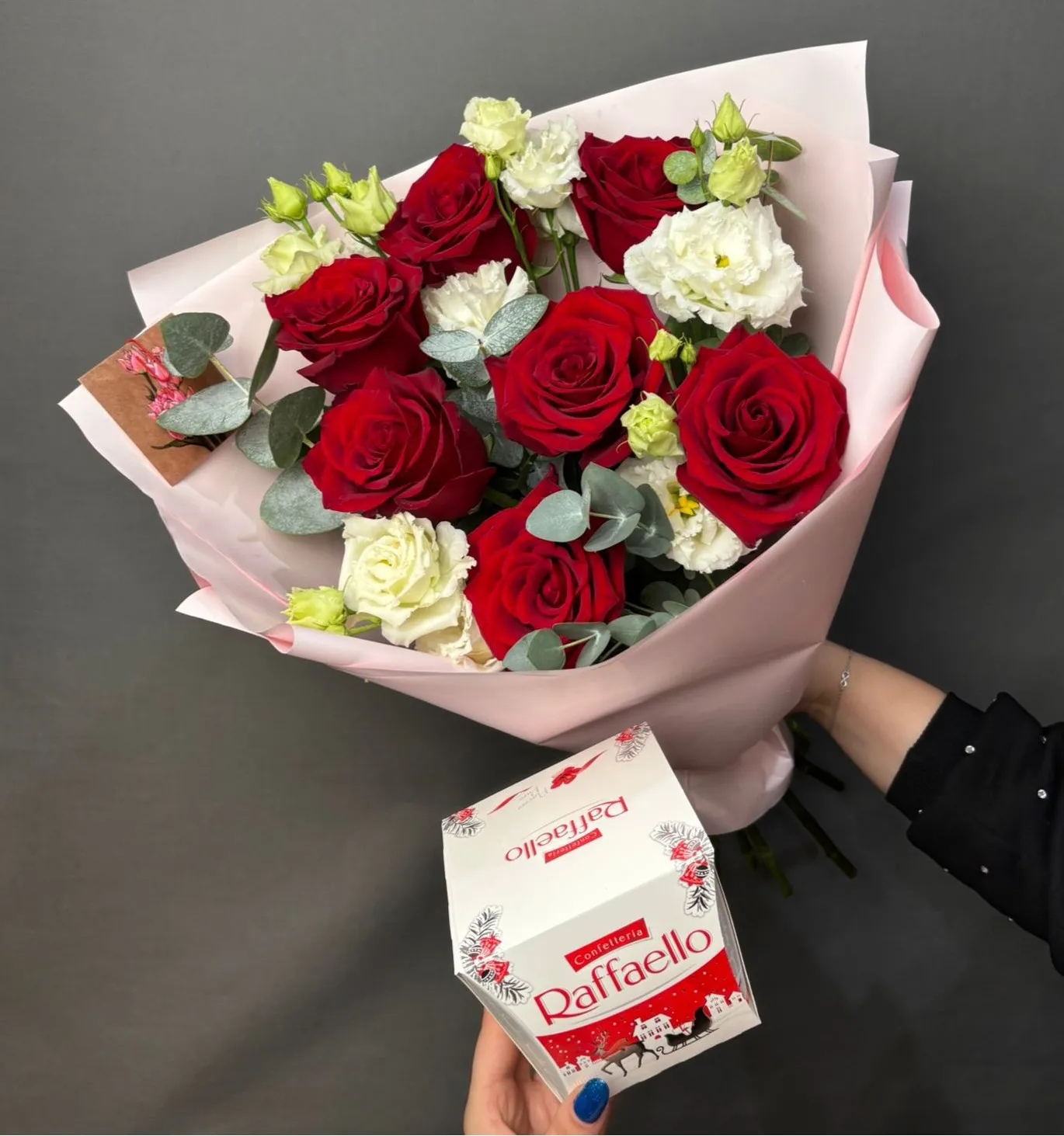 Роза красная. эустома, упаковка, лента, конфеты рафаэлло