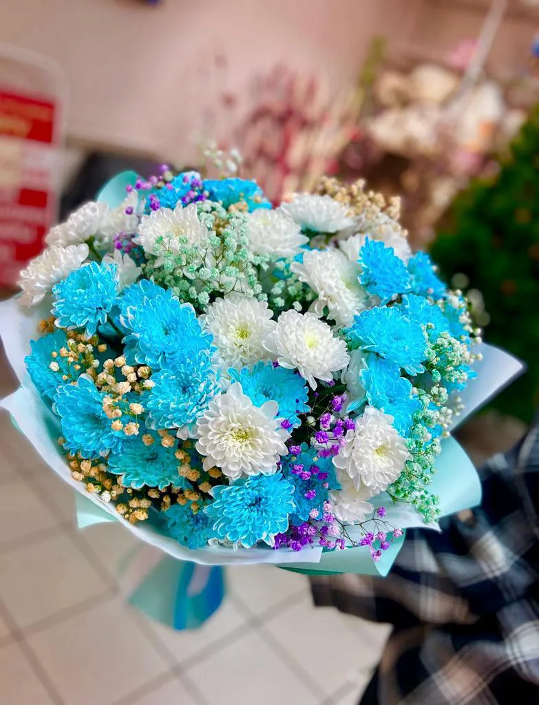 • Средний кустовая хризантема - 7 шт., гипсофила, упаковка, лента