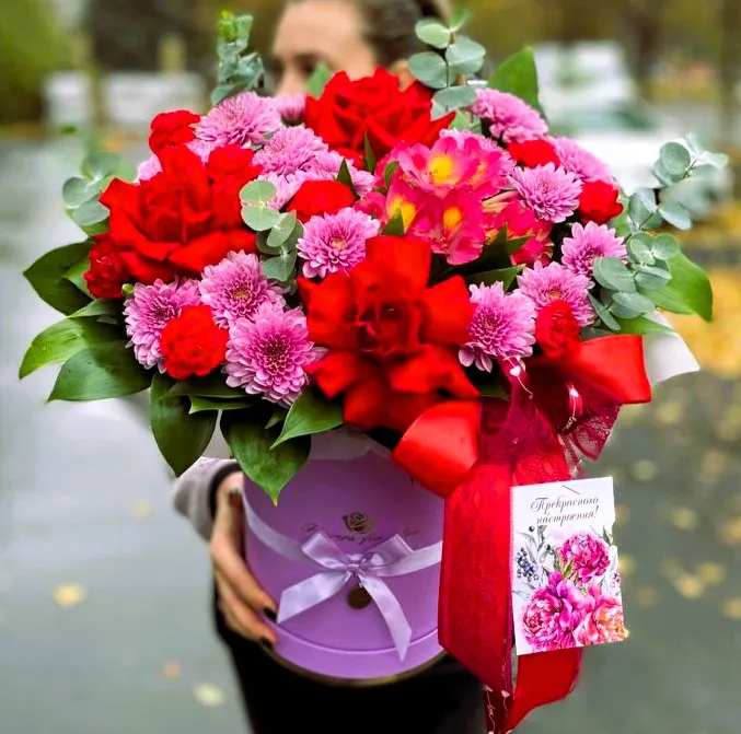 Розы,хризантема кустовая, гвоздика, альстромерии, оавзис,шляпная коробка